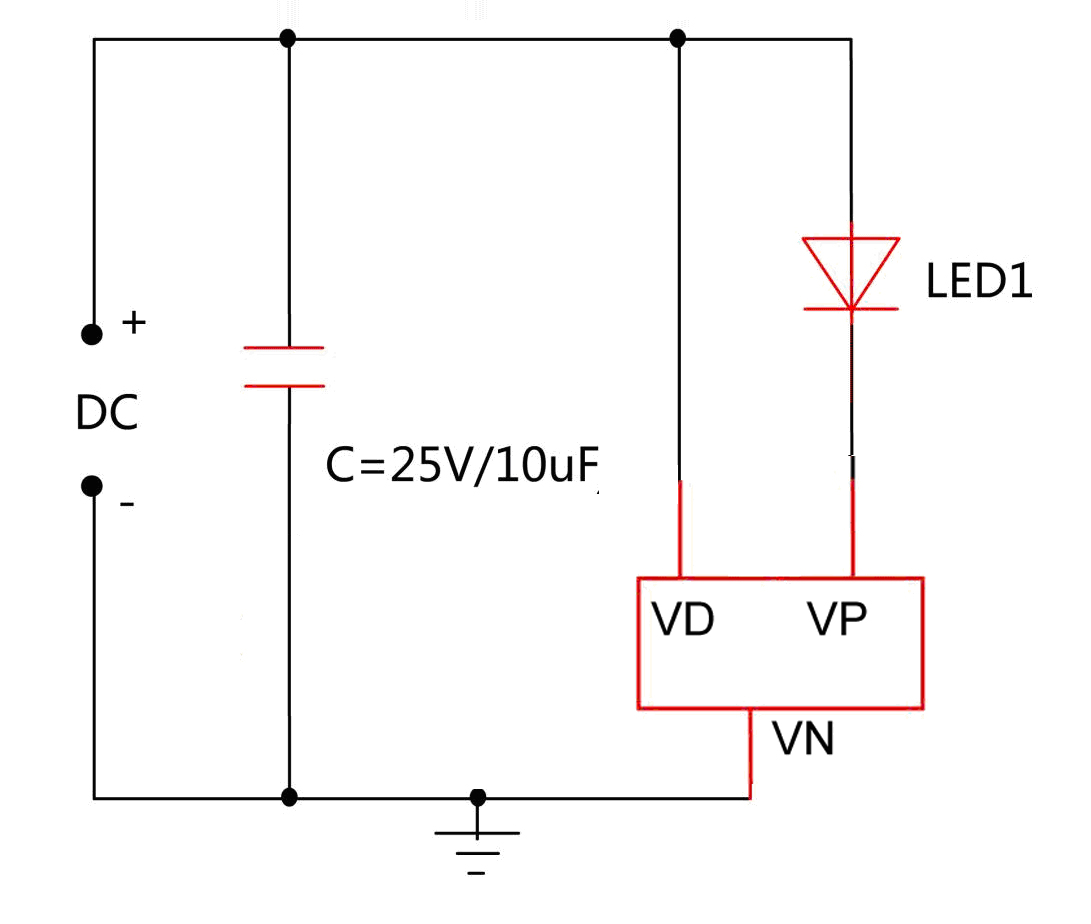 HX305的VD引腳加一個4.7uF左右的濾波電容,且該電容應盡可能靠近VDD引腳和地。一方面,該濾波電容可以減小系統上電時VDD引腳的電壓尖峰,避免IC因過壓而損壞,另一方面,當IC進入過溫保護狀態時,該濾波電容可以避免在電源VD上出現因輸出電流波動而導致的大的紋波。