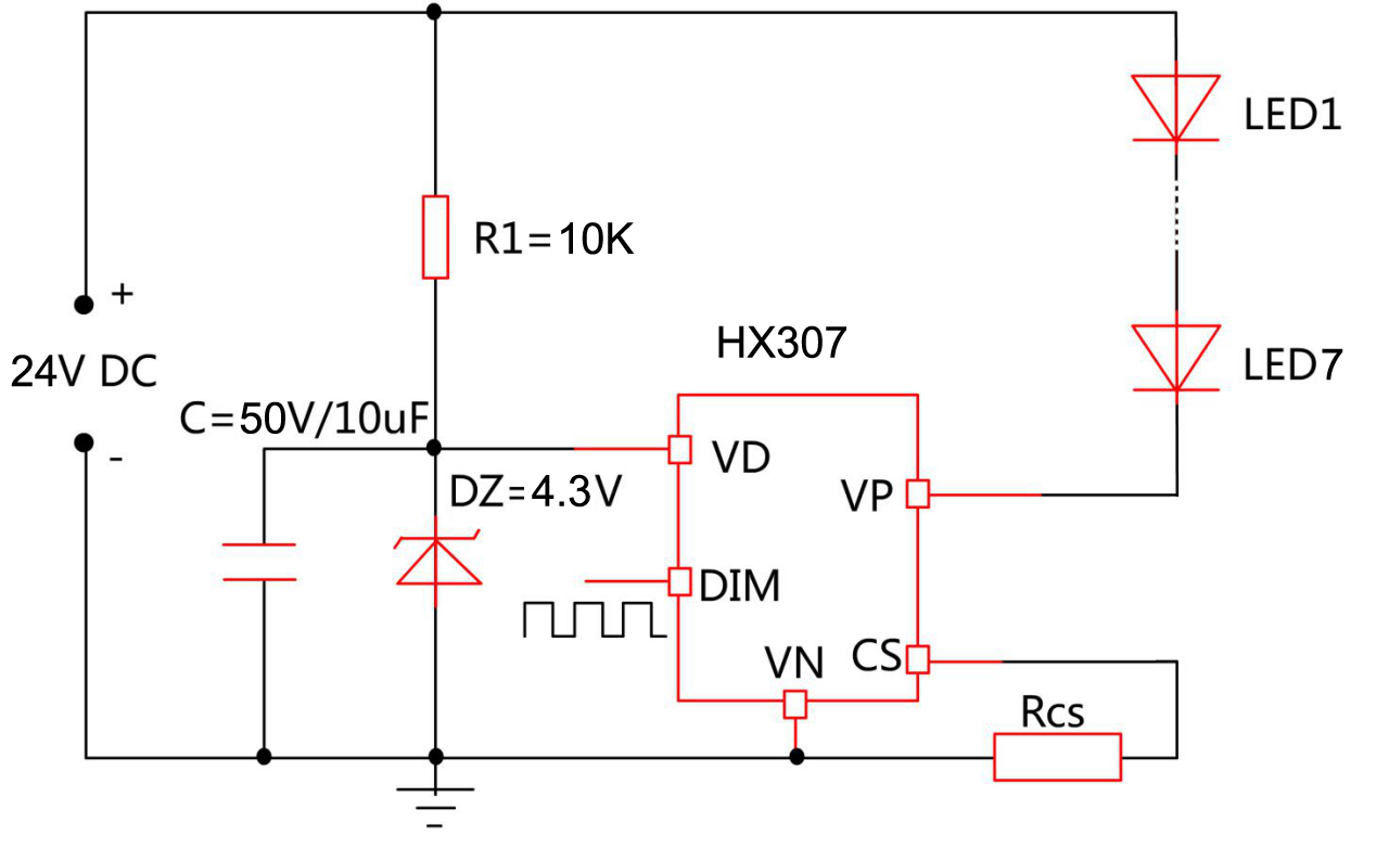 HX307的電源腳VD工作電壓范圍為2.5-6.0V,當電源電壓高過6V時通過外接穩(wěn)壓二極管使芯片工作鉗位在6V以內(nèi)即可滿足高壓大電流恒流LED驅(qū)動。