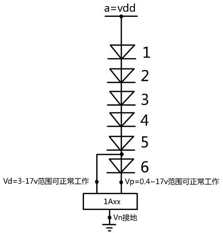 3, IC有三個腳,Vd, Vp, Vn。Vd正常工作電壓在3-17v, Vp正常工作電壓在0.4~17v, 假定燈珠1,2,3,4,5,6 的Vf都為3v,故30米后a點電壓變成18.5v時Vp點電壓為0.5v, Vd點電壓變成3.5v,這樣,Vd與Vp都處在正常工作電壓內,處于正常恒流狀態。得出結論:華芯串IC式燈條單端供電可達30米,雙端供電就是60米了,而且亮度一至。