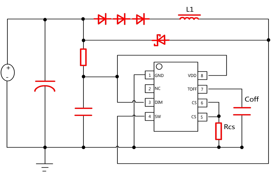 調光腳,支持PWM調光和線性調光;DIM接地則關斷輸出,DIM電壓高過3.0V則電流100%輸出