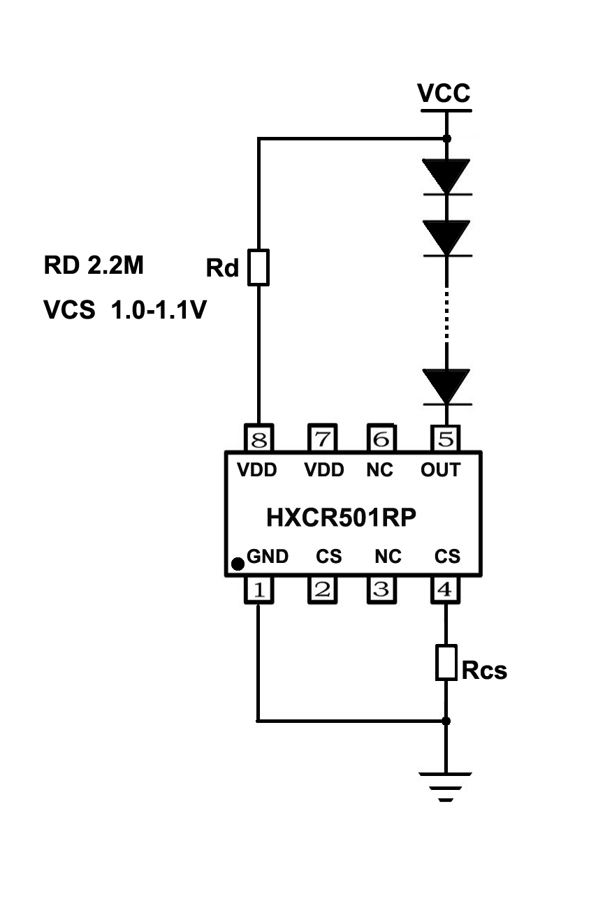 HXCR501RP是一款適用于線性照明及中低壓照明恒流驅動器,具有良好的抗沖擊能力和高可靠性。電流由連接CS腳與GND腳的電阻RCS設定,電流高達500MA,恒流精度高,一致性好,LED電流也可以使用PWM調光控制。具有負溫度系數,在高溫下降低電流以自我保護。適用于5-60V恒壓電源供電,系統結構簡單,外圍元件極少,方案成本低。