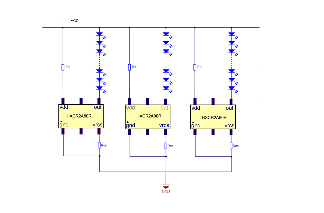 HXCR2A80R是一款內置高耐壓功率器件恒流驅動器,適用于軟燈帶、硬燈條和照明燈板等應用的中低壓照明恒流驅動器,具有良好的抗沖擊能力和高可靠性。LED電流由連接CS腳與GND腳的電阻RCS設定,恒流精度高,一致性好,LED電流也可以使用PWM調光控制。適用于恒壓電源供電,不需要額外組件,系統結構簡單,外圍元件極少,方案成本低。