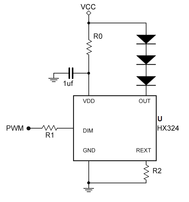 芯片的VCC電壓范圍為5~40V,低壓差驅動,使得HX324能夠在寬驅動電壓范圍內提供穩定的電流輸出。HX324外圍元件少,應用可靠性好。