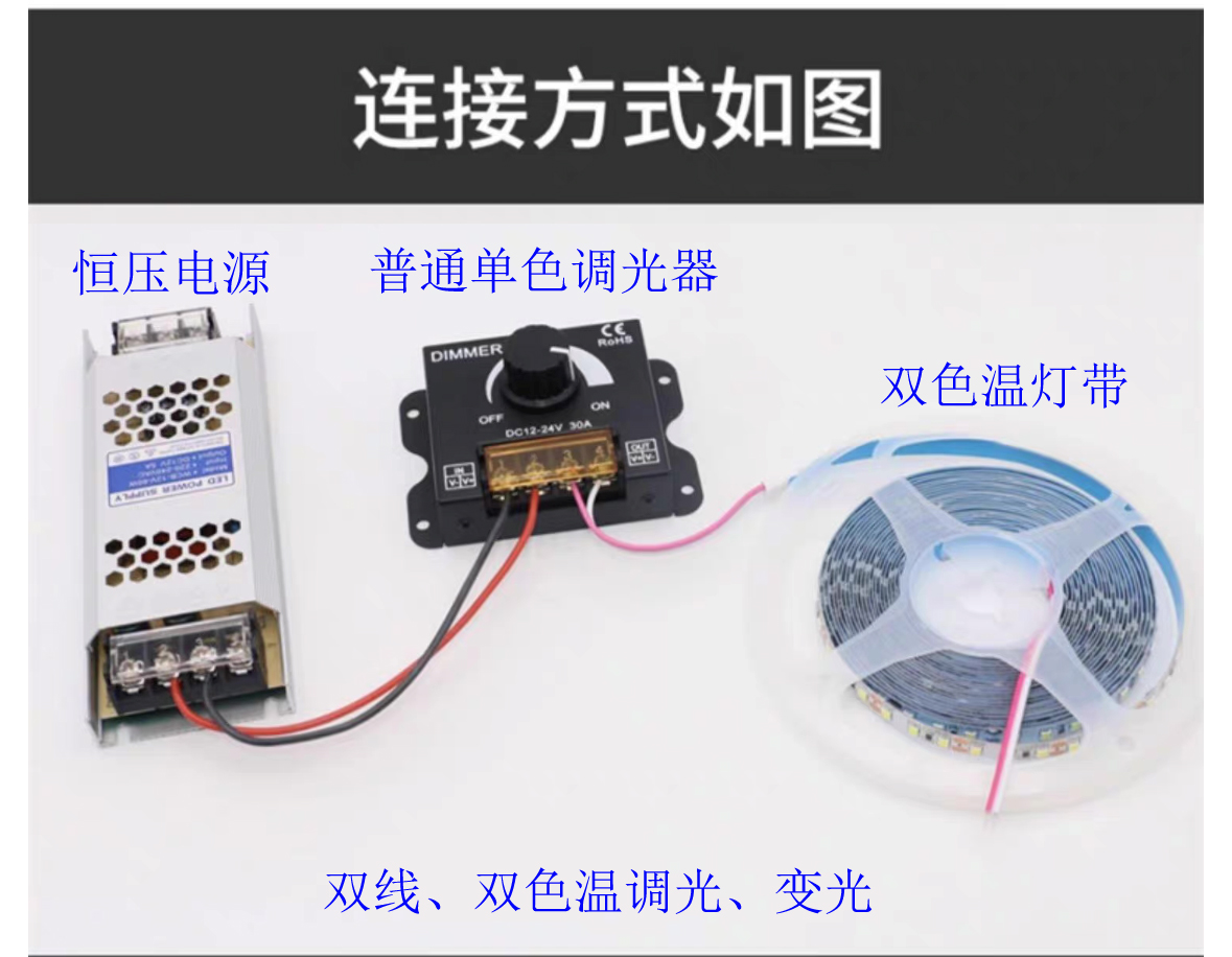 將PWM調光器串聯接入電源,使用兩種色溫不同的燈珠來實現色溫調節,OUT1支路使用冷白色溫燈珠,OUT2支路使用暖白色溫燈珠。